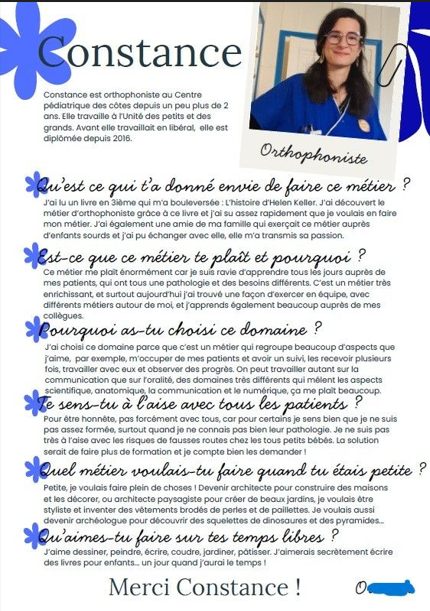 👉 Permettre à une patiente de devenir reporter du CPDC, d’interviewer les professionnels du centre pour mieux comprendre leurs métiers et, au passage, renforcer la relation entre soignants et patients.