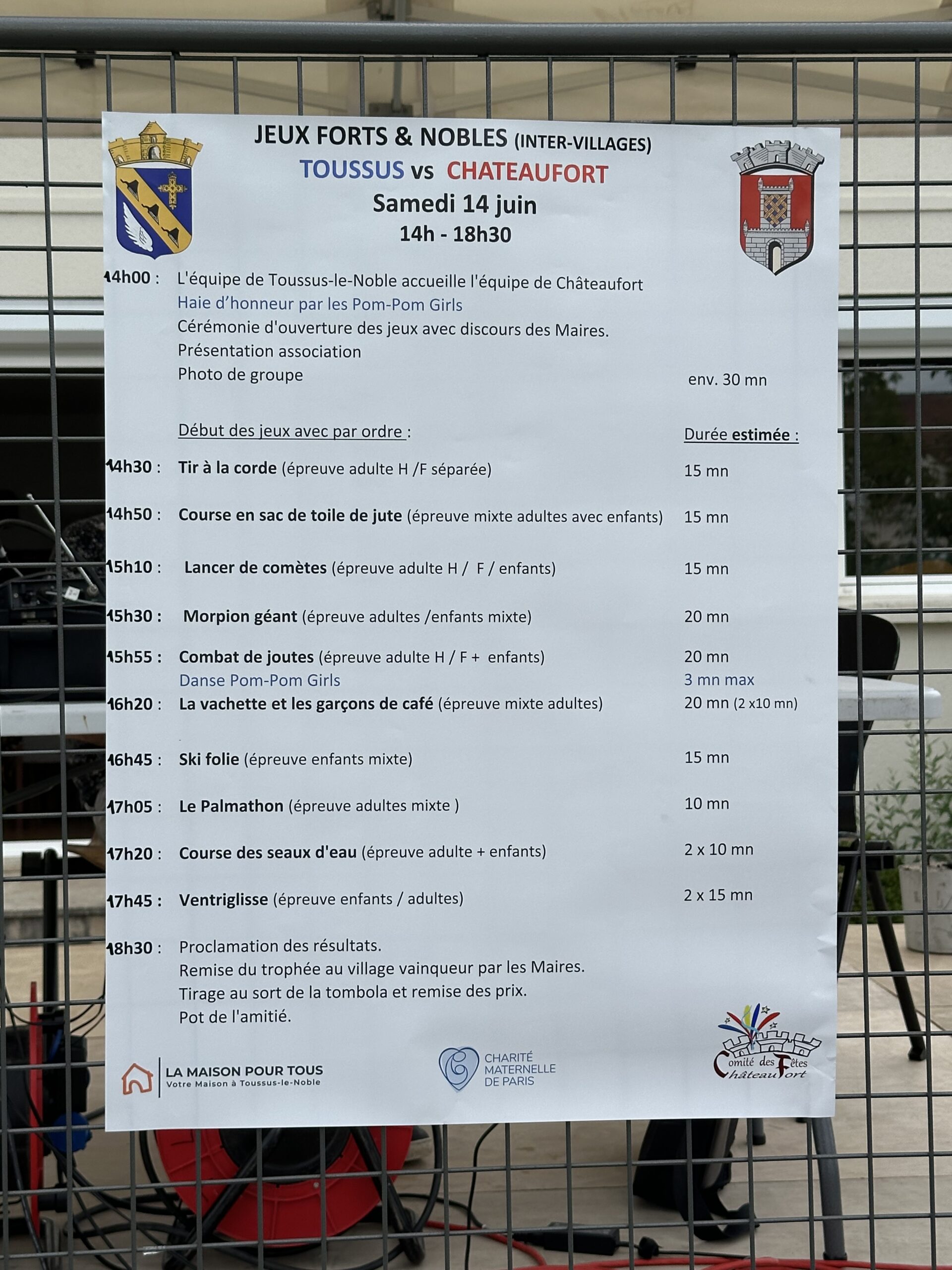 Le samedi 14 juin 2025, les communes de Toussus-le-Noble et Châteaufort ont une nouvelle fois uni leurs forces pour organiser Les Jeux Forts et Nobles, une journée sportive, conviviale et solidaire réunissant habitants, bénévoles et élus autour d’épreuves aussi ludiques que fédératrices. Comme chaque année, l’événement avait pour objectif de soutenir une cause locale. Grâce à la mobilisation exceptionnelle des participants et des bénévoles, un don au profit du Centre a pu être collecté.